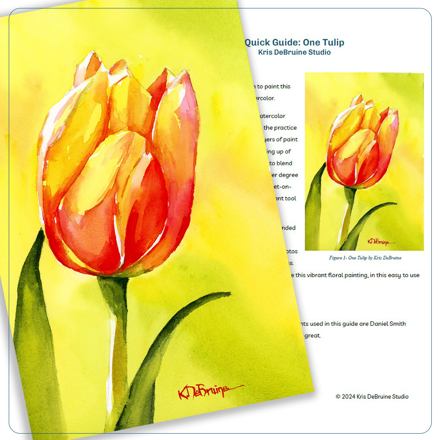Use this Quick Guide to learn how to paint a multi-colored tulip in watercolor. This lesson focuses on the important watercolor technique called glazing. The 10-page guide includes high quality photographs and detailed text instructions for every step of the painting process. You also receive a contour line drawing reference image and a list of recommended supplies and materials in this easy to use PDF document.